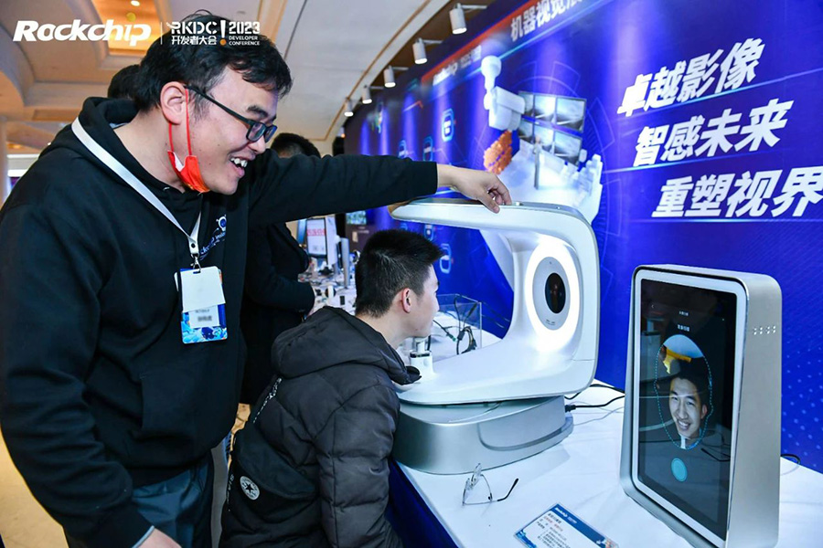 In Machine Vision booth, there were a number of front-end and back-end applications based on Rockchip’s vision solutions RV1103 RV1106 / RV1108 RV1109 / RV1126, covering IPC, access gate, smart doorbells, 3D structured light module, in-vehicle images, etc., using a series of proprietary technology including ISP technology, Algorithm, fast start with low power, smart video coding, and binocular vision based image stitching, EIS (Electric Image Stabilization), etc.